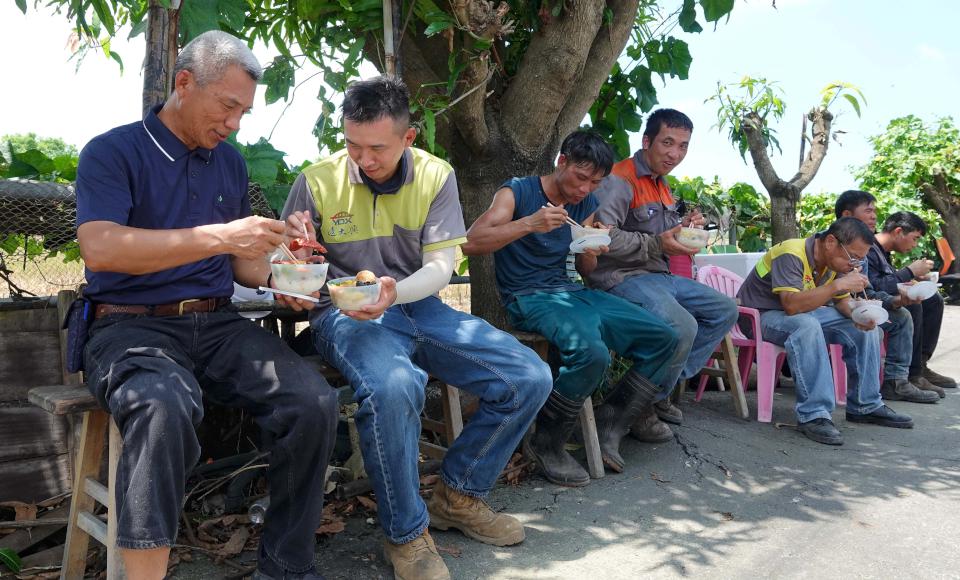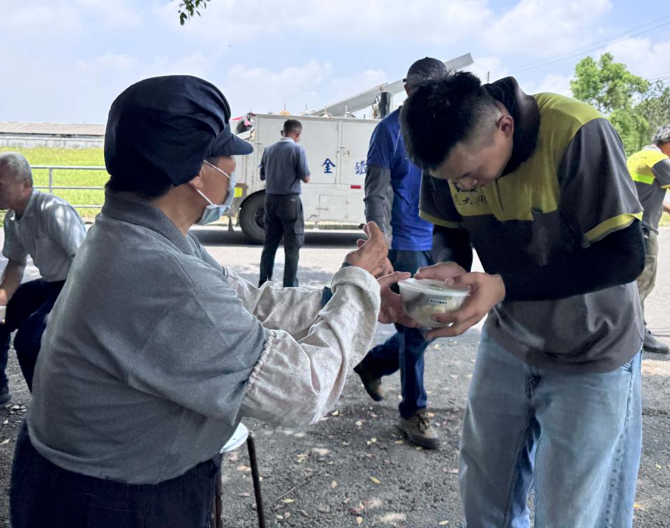 中颱丹娜絲重創南台灣,災後重建持續進行,慈濟基金會高雄分會志工策畫父親節感恩系列活動,慈濟太保共修處前一天備妥便當、蛋糕、西瓜、配菜、甜點,8月8日送抵嘉義縣六腳鄉塗師村廟前榕樹下,款待修繕工班人員享用午餐,志工陳妙美說,平常膳食多數炒麵及麵線糊,希望便當能讓大家吃飽,適逢父親節,感佩工班人員協助獨居長者等對象重建家園。越南移工阿程說,家鄉不會慶祝父親節,感謝慈濟志工關心,享用特別美味午餐。