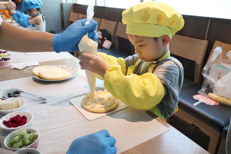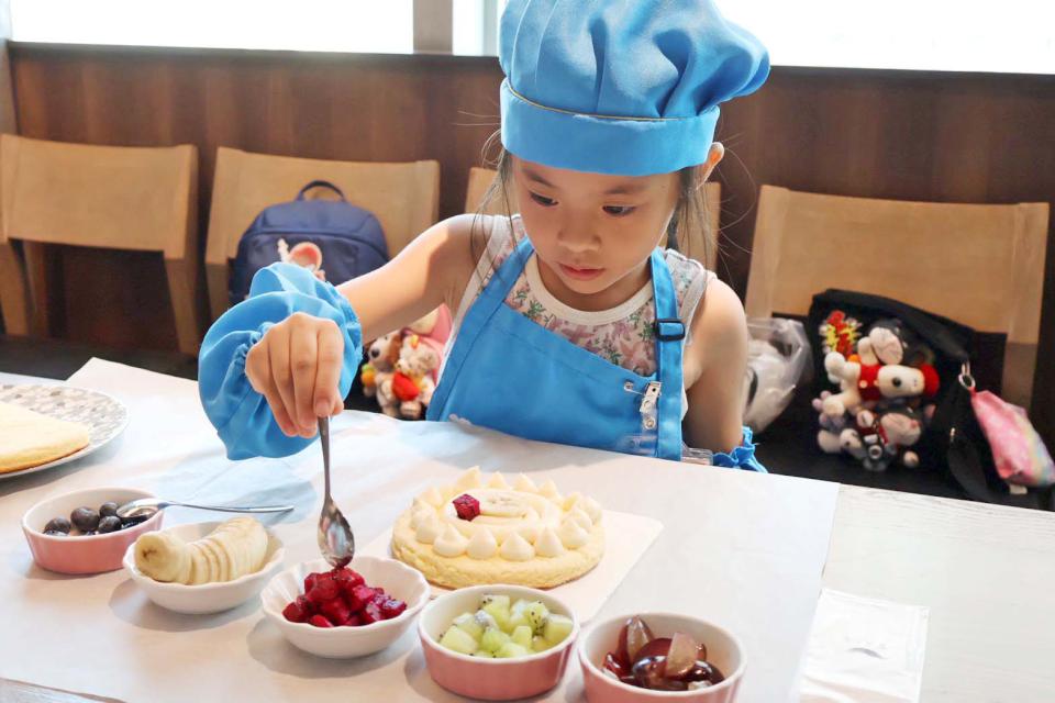 高市農業局攜手知名餐飲集團8月21日及24日在苓雅及前鎮兩處吃到飽餐廳營業據點合辦小小廚神活動,邀請行政主廚張文彬、副主廚柯志來、廚務主任陳惠珍、廚務組長陳文彥,指導親子利用旗山香蕉與大崗山龍眼蜂蜜製作限定版香蕉蜂蜜蛋糕,過程融入食農教育增添樂趣。