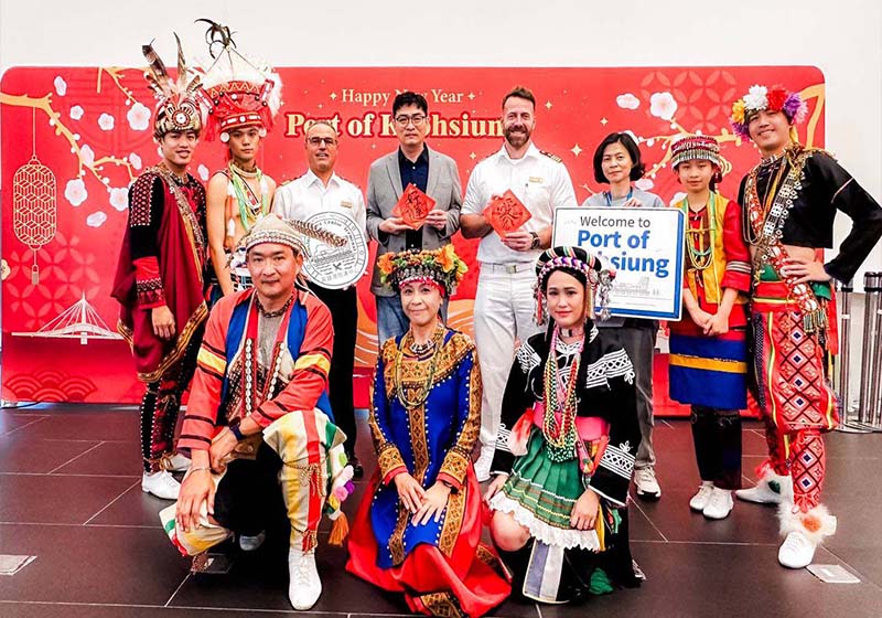 高雄港1月25日喜迎愛達郵輪愛達女神(AIDAdiva)與麗星郵輪探索星號(Star Navigator)接力泊靠,臺灣高雄港務噴水並由處長蔡建郎(圖二左)代表致贈愛達女神船長(圖二右)首航紀念牌,還結合高市海洋局原住民傳統舞蹈表演,喜迎1970名旅客,也安排乘客體驗手寫春聯。