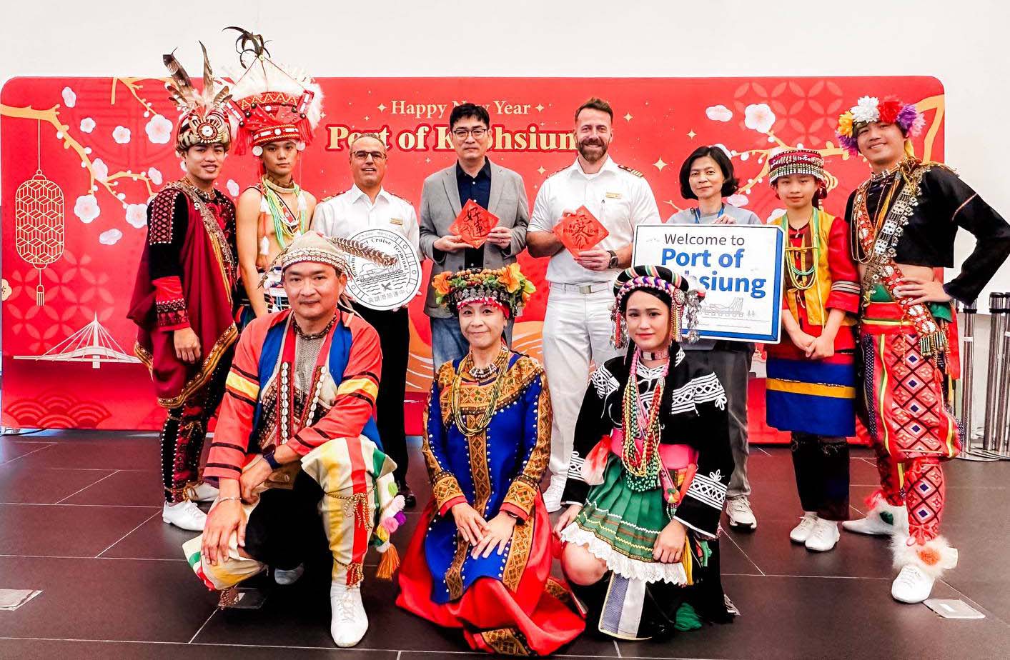 高雄港喜迎愛達女神、探索星號雙郵輪接力泊靠 噴水贈紀念牌原民舞蹈手寫春聯迎賓