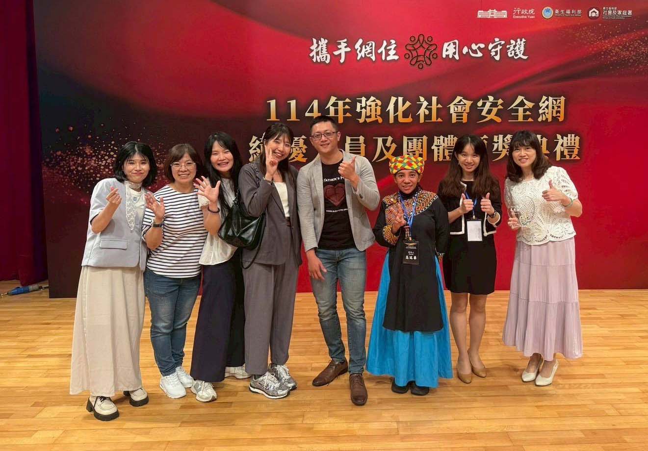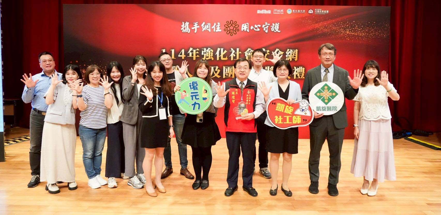 衛生福利部7月26日舉行114年強化社會安全網績優人員及團體評選暨表揚活動頒獎典禮,高市社會局鳳山五甲社會福利服務中心社工郭世昌(圖一右二)、桃源區原住民族家庭服務中心社工高瑞華(圖二中)、毒品防制局個管員吳惠娜(圖一右一)、高雄長庚醫院(圖一右一醫師徐美欣)、凱旋醫院(圖一左二院長周煌智)等個人及團體獲獎,市府持續支持第一線同仁,深化公私協力及跨網絡合作,完善社會福利服務。