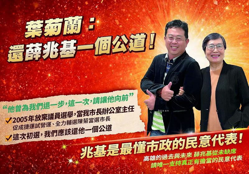 葉菊蘭說,政治最難的,從來不是站在鎂光燈前,而是在沒有人看見的地方,依然選擇對得起良心。薛兆基把委屈留給自己,把責任留給城市,這樣的選擇,不該被遺忘,更不該被抹黑。在初選最後關頭,她呼籲選民靜下心來,看清事實、記住時間留下的痕跡,還薛兆基一個公道,不只是為了一個人,而是為了讓高雄知道,有些承擔,很安靜,卻很重。