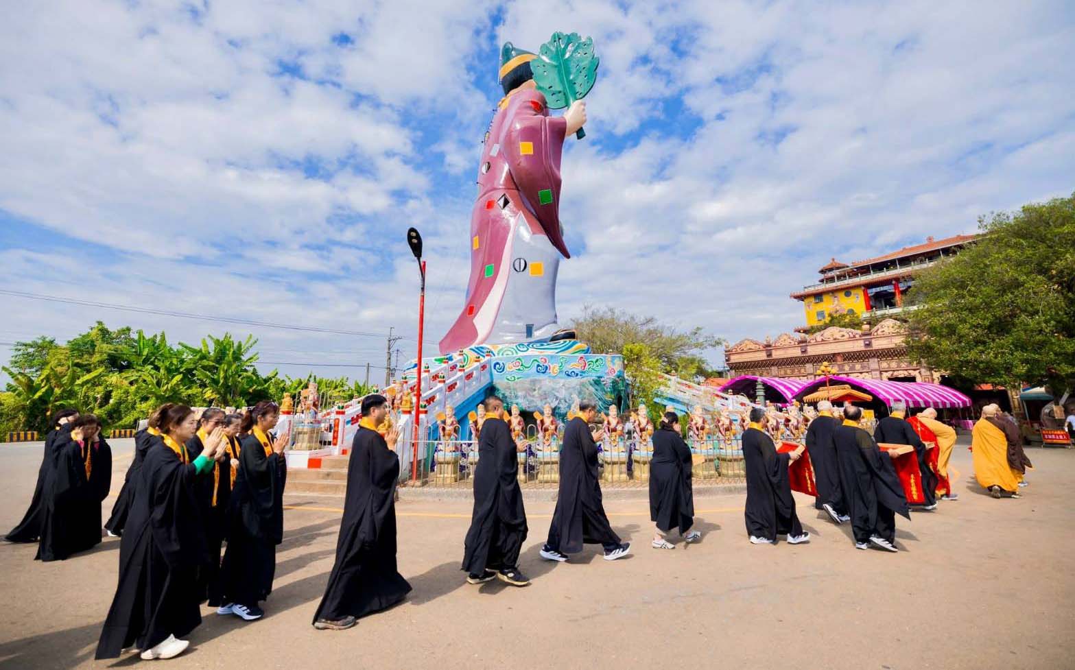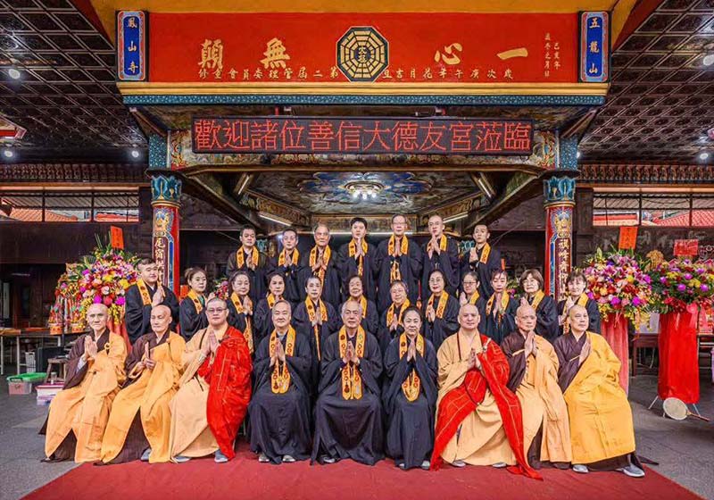 歡慶觀音菩薩開光80週年、五龍尊神開山70週年與濟公活佛得道816週年紀念日,高雄旗尾五龍山鳳山寺11月22日席開逾300桌,各地友宮廟代表、信眾香客虔誠參拜祝賀,苗栗縣苑裡鎮天旨五顯宮宮主陳俊辰、總幹事陳美麗等人南下禮敬諸神佛同霑法喜,祈願國泰民安、風調雨順、闔家平安。圖/苗栗苑裡天旨五顯宮提供、文/高培德