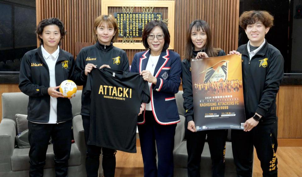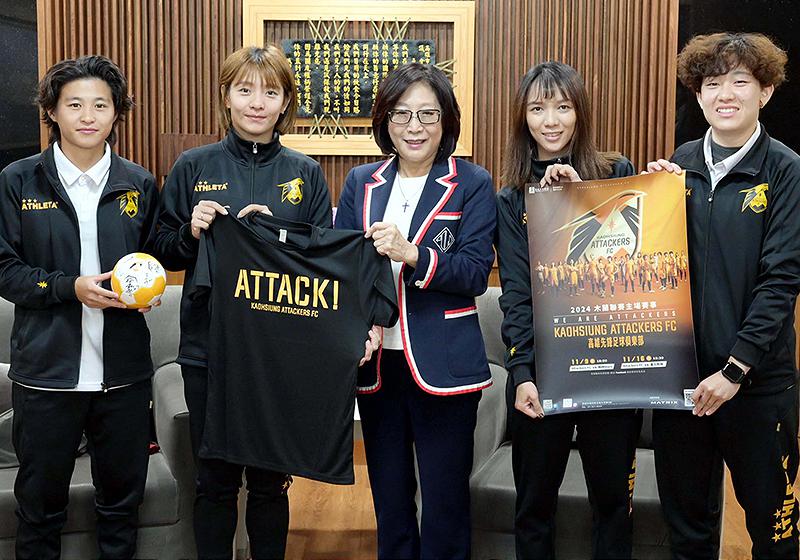 2024木蘭足球聯賽冠軍ATTACKERS先鋒女足隊吳愷晴、呂孟舫等成員,12月18日在市議員鄭孟洳陪同下走訪市議會,致贈議長康裕成球衣與簽名迷你足球,並分享參賽心路歷程,重新回顧摘金影片,康裕成直呼「超感動」,邀請大家支持在地球隊。圖/市議會提供、文/高培德