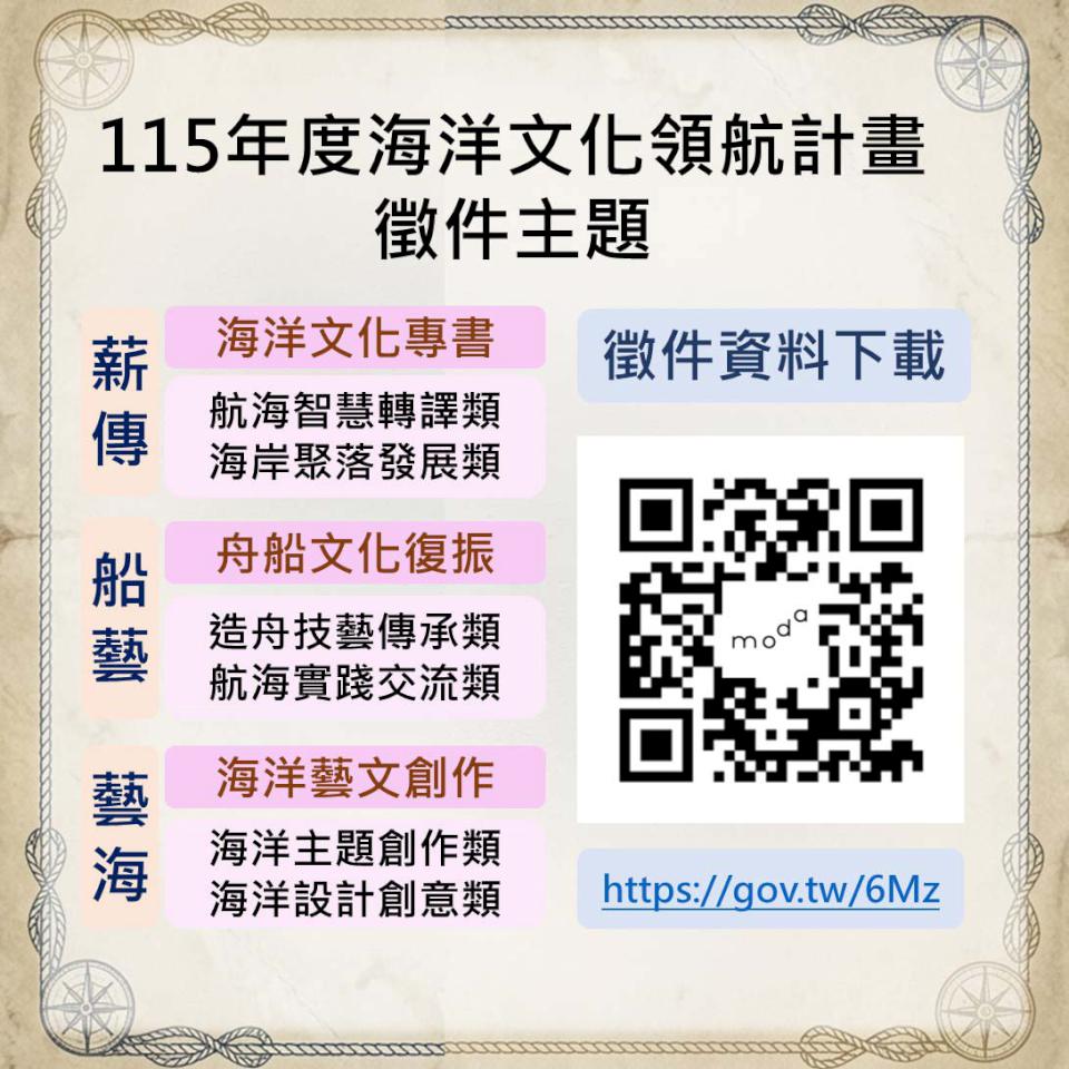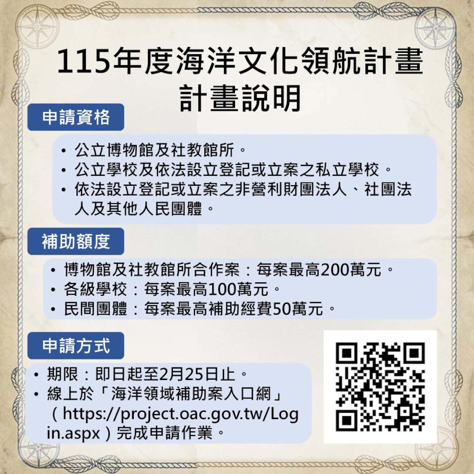 海洋委員會115年海洋文化領航計畫區分著重海洋文化知識整理及轉譯薪傳、聚焦舟船技藝與航海實踐船藝、涵蓋造舟技藝傳承、修復、航行及國內外交流藝海等三大類,其中藝海新增海洋設計創意類,鼓勵設計者導入海洋文化意象應用文化創意產業,透過產品設計、品牌轉譯與視覺創新貼近生活,即日起至2月25日受理各級學校、民間團體及博物館、社教館所上網(https://project.oac.gov.tw/Login.aspx)申請,學校每件最高補助100萬元,民間團體最高50萬元,公立博物館及社教館所最高200萬元,主辦單位2月5日辦理2場線上徵件說明會,介紹計畫理念、類別及申請流程,歡迎上網(https://forms.gle/WucChzhgetgMpp7t8)預約報名。圖/海委會提供、文/高培德