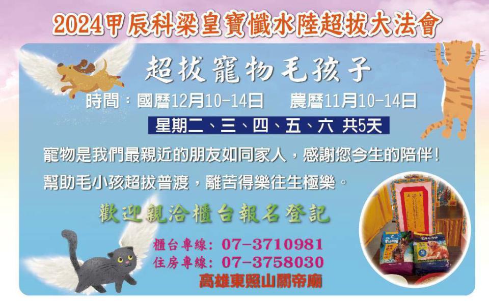 高雄東照山關帝廟 12月10日至15日舉行2024甲辰科護國五朝祈安禮斗粱皇寶懺水陸超拔大法會,配合古禮致敬北斗星君《賜福真經》、南斗星君《延夀真經》,正式登場前,斗首各醮主爭相奪標,祈願新年獲得神明庇佑,東照山關帝廟主委潘献有說,法會維持寵物壇,拔薦超度毛孩,同步設置超拔九玄七祖、累世冤親債主壇位,開放預約中。