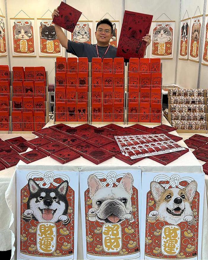 高市青創插畫事務所114年春節推出54款貓狗圖案春聯、紅包袋等限量賀歲周邊商品,吸引藏家下訂,目標蒐集12生肖,邱姓創辦人感謝青年局200萬元貸款利息補貼,協助減輕參展負擔。