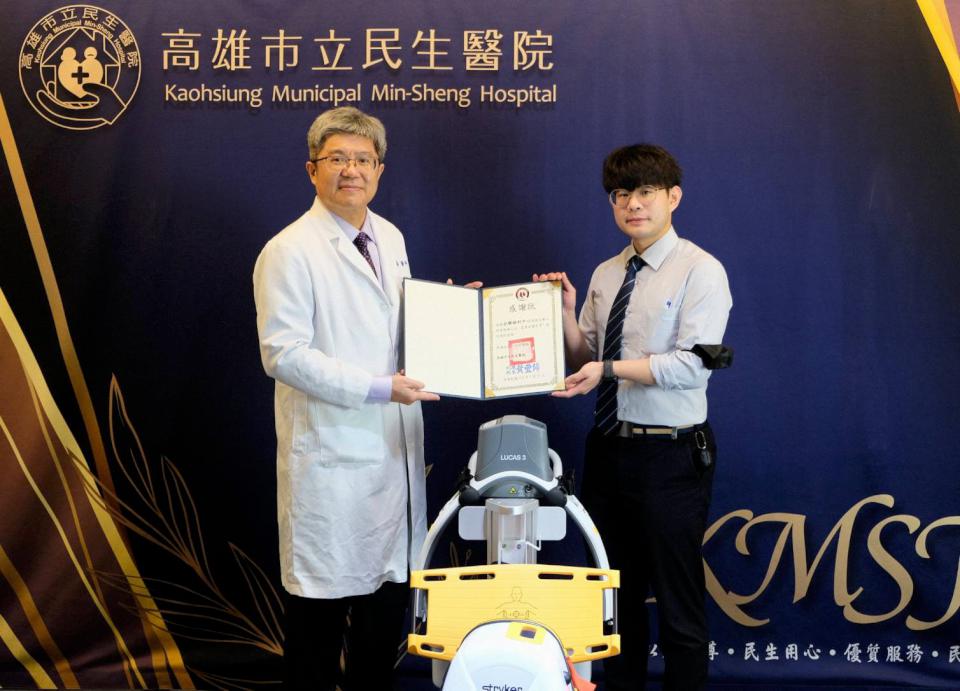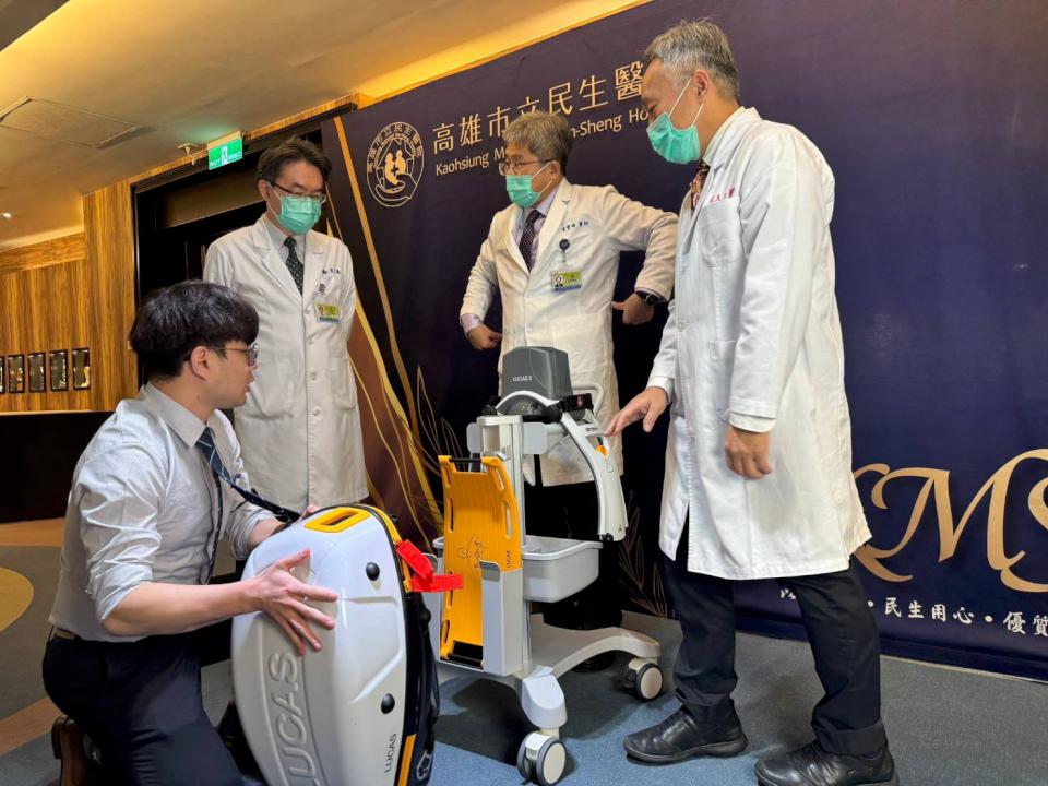 台語歌后江蕙與知名連鎖超市1月21日捐贈高市民生醫院市值百萬元新型自動心肺復甦機,強化急重症醫療量能,民生醫院代理院長黃豐締(圖一左)說,急診醫療人員視時間如生命,受贈設備提升急救品質,未來續強化急診量能,提供病友專業快速治療。圖/民生醫院提供、文/高培德