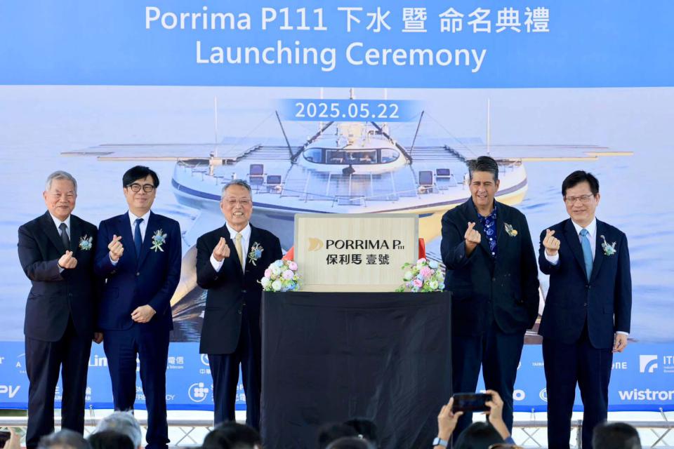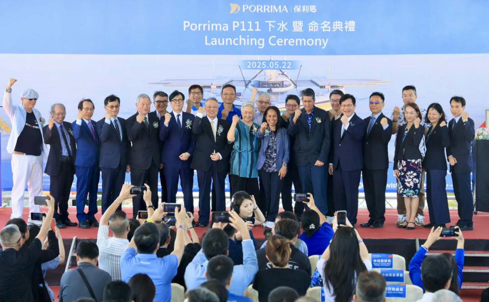 宏碁創辦人施振榮創立保利馬結合高市嘉信遊艇領先全球生產首艘淨零碳排未來船「Porrima P111」5月22日在高市茄萣區興達港下水同步命名,帛琉共和國總統惠恕仁、總統府資政沈榮津、外交部長林佳龍、經濟部次長何晉滄、高雄市長陳其邁等人見證誌慶,完成測試後巡迴全台,預計10月航行日本訪問,未來作為帛琉貝里琉高端潛水及生態旅遊船使用,保利馬也續推新品長77呎P77,預計2026年中下水營運。圖/海洋局提供、文/高培德