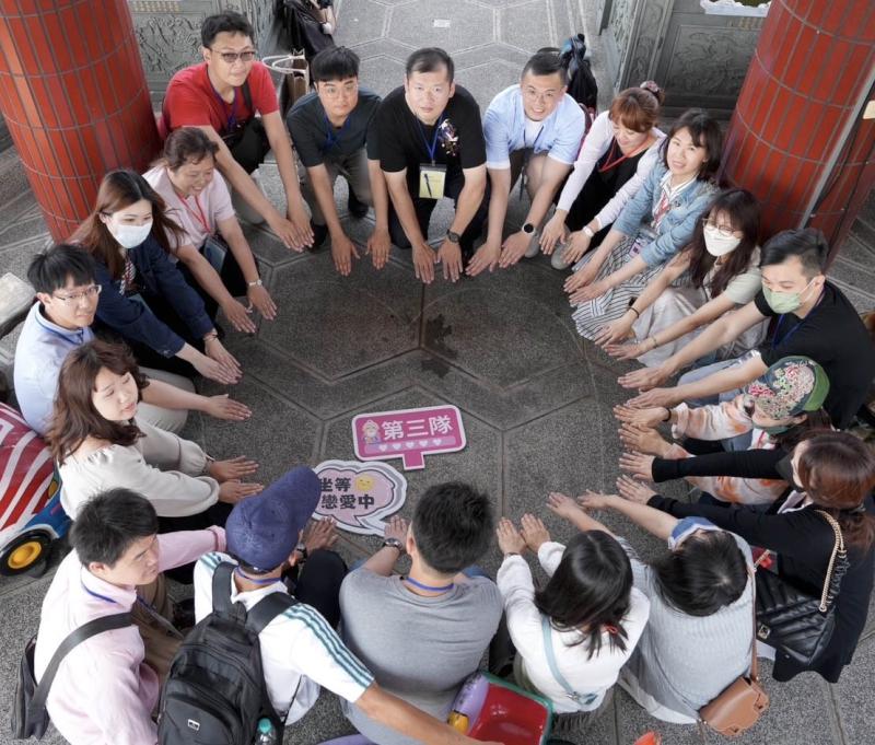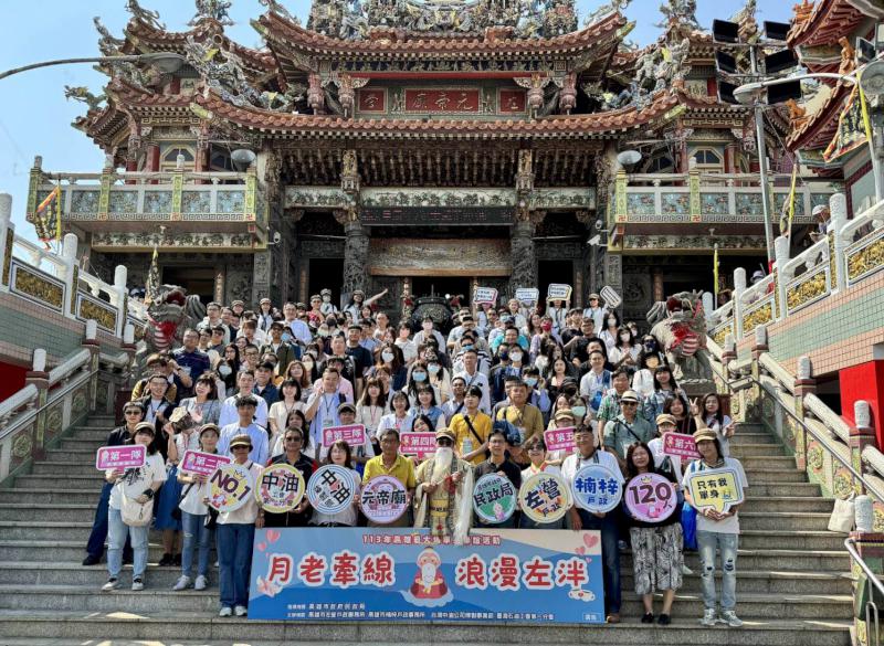 高市左營、楠梓戶政事務所、台灣中油煉製事業部、臺灣石油工會第一分會合辦「月老牽線浪漫左泮」單身聯誼活動4月21日在元帝廟、玄天上帝北極亭、泮咖啡等地舉行,吸引120名單身未婚男女參與換桌聯誼、趣味競賽等活動,每名參與者名牌放置月老祠祈願月老星君庇佑賜良緣,元帝廟也致贈每人雙心紅線手環,每人可填寫5張告白卡,並由戶所人員轉交心儀對象,擴大配對成功機率,民政局專委楊進祿、台灣中油煉製事業部主任林麗玲、左營戶政所主任許鳳蘭等人到場表達支持,祝福在場男女早日脫單,台灣中油煉製事業部致贈80張電影票、14張自助餐券,增進94名參與者互動機會。圖/左營戶政所提供、文/高培德