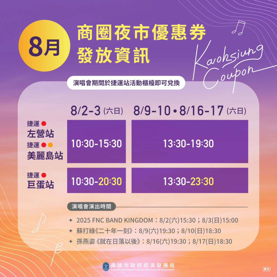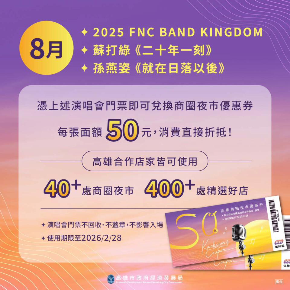 高市喜迎8月2、3日韓國娛樂公司旗下FTISLAND、CNBLUE等5組樂團《2025 FNC BAND KINGDOM IN KAOHSIUNG》、8月9、10日金曲天團蘇打綠《二十年一刻》巡迴演唱會終點站、8月16、17日高雄巨蛋華語天后孫燕姿《就在日落以後》巡迴演唱會等音樂盛會,高市經發局續推50元商圈夜市優惠券,歌迷持指定演唱會門票可前往高雄捷運左營、巨蛋站及美麗島站兌換,適用逾40處商圈夜市及逾400處合作店家。