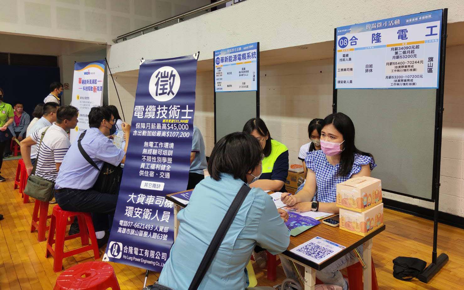 高市勞工局訓練就業中心8月16日在苓雅運動中心舉行「樂業高雄、幸福融融」現場徵才活動,邀集鴻海精密、寒軒飯店、大樹藥局、亞尼克菓子等51家企業,釋出儲備幹部、工程師、門市銷售專員、餐飲服務人員、技術員、作業員等工作機會,吸引超過1100人投遞履歷,初步媒合率約52%,勞工局長江健興到場關心徵才情形,勞工局設置就業促進措施攤位,提供CPAS職業適性診斷測驗等諮詢服務。