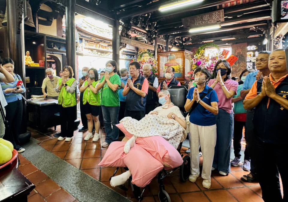 高雄鳳山龍山寺主委劉盡忠認助愛心文旦樹一棵,售出中秋禮盒挹注創世基金會鳳山分院植物人安養經費,8月22日與植物人病友蔡姓男子及母親、創世基金會鳳山分院院長林瑪俐及同仁上香參拜,祈願觀世音菩薩加持庇佑擺脫貧病,並將認助名牌懸掛文旦樹象徵二次公益,禮盒轉贈植物人病友家庭。
