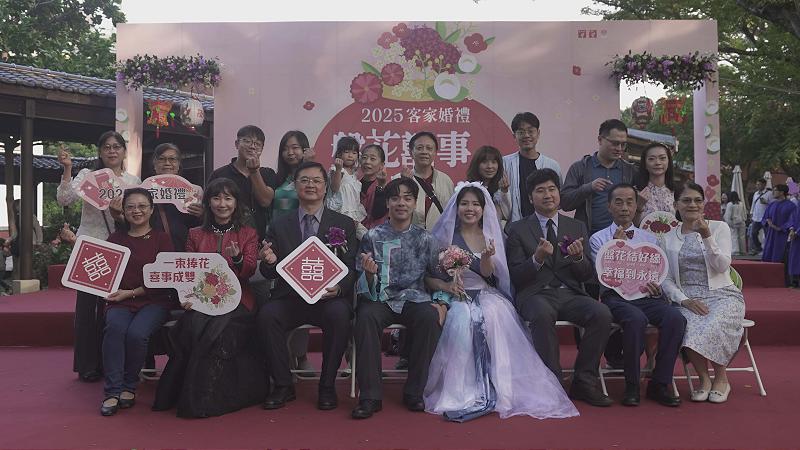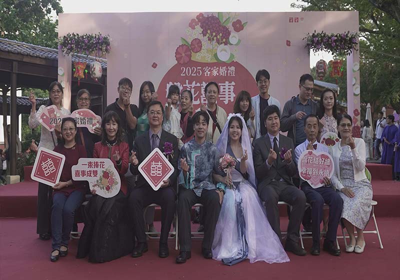 高市客委會客家婚禮11月29日在新客家文化園區舉行,副市長羅達生油紙傘裝飾雨豆樹步道證婚21 對新人,客家八音帶路象徵「起家」,新人穿著客家禮服接受眾人祝福,展現傳統與時尚交織獨特韻味。典禮後依循古禮完成上燈、插頭花、食新人茶等儀式。羅達生用客語「茶杯圓圓、幸福良緣」表達祝福,也期盼客家文化持續紮根生活。