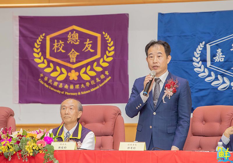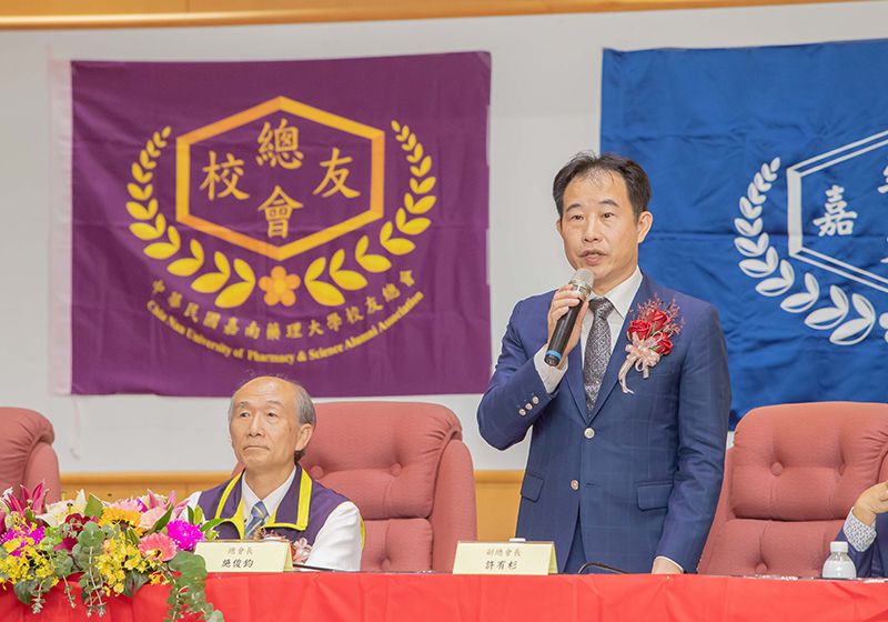 新任第九屆總會長許有杉首先帶領全體與會人員向第一屆連瑞猛學長的離世默哀,感念連學長指導與分享,許有杉自詡是一名「嘉藥粉」,他表示,有鑑於少子化及私校弱勢化的趨勢,個人將率先捐贈一百萬獎學金,並成立嘉藥學弟妹獎學金專戶,專款專用來資助學弟妹完成課業,獲得在場所有人熱烈回響,許會長也計畫推動與學校更密切的產學合作,積極發揮校友在全國影響力與通路,協助母校優秀研發成果商品化,校友總會也將強化嘉藥磐石會運作,廣納前輩的經驗,攜手重返「嘉藥人」的榮耀。