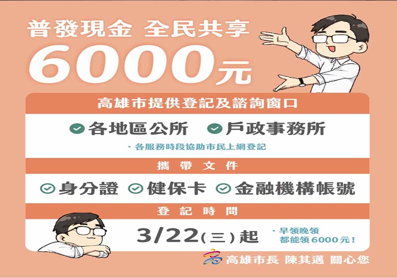中央5方式普發現金6000元 高市區公所、戶政所3月22日開放登記諮詢