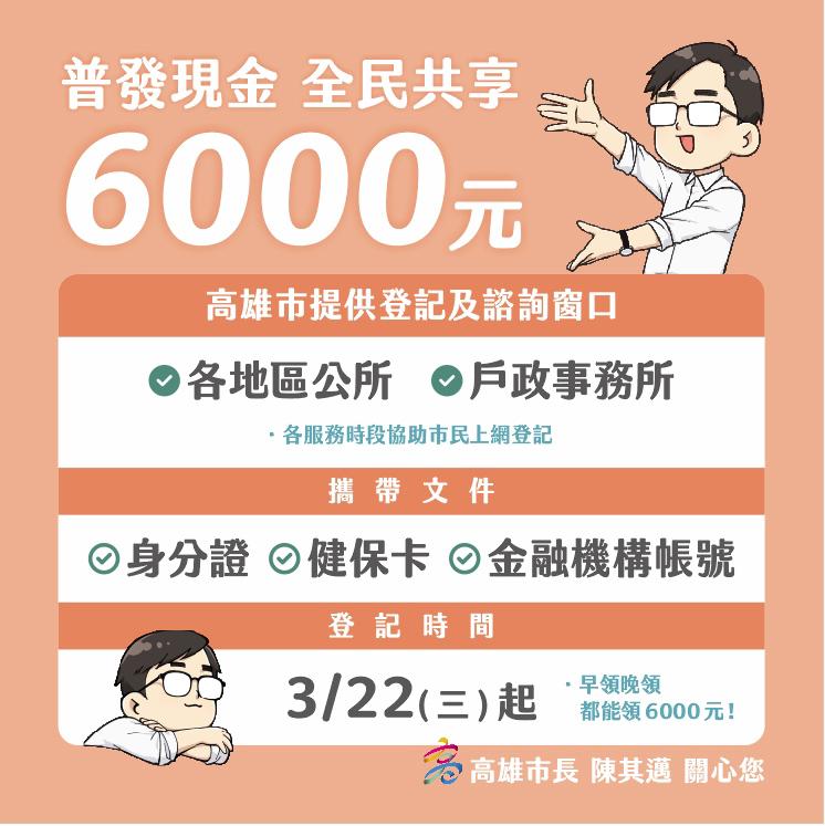 中央規劃採「登記入帳」、「ATM領現」、「郵局領現」、「直接入帳」及「特定偏鄉造冊發放」等5種方式普發現金6000元,高雄市民3月22日上午8點起可攜帶身分證、健保卡、金融機構帳號,前往全市38處區公所及48處戶政事務所辦理上網登記及諮詢。