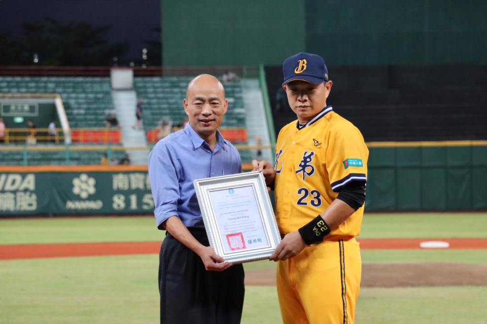 昨晚澄清湖棒球場由中信兄弟作客出戰統一獅,也是人氣球星「恰恰」彭政閔球員生涯在高雄的最終戰,高雄市長韓國瑜賽前特別現身球場,致贈高雄市榮譽市民證書,以及紀念棒球,上面有他的親筆簽名,給彭政閔留念。韓國瑜感謝恰恰長年為球隊、為國家竭力付出,可說是台灣體壇的典範,也是高雄人的驕傲,相信他在棒球界的努力與成就,會是許多年輕球員學習榜樣。