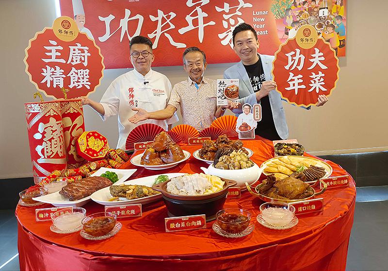喜迎蛇年,高雄老字號餐飲品牌鄧師傅功夫菜續主打經典年菜,並新推熱炒吧系列商品,獨身族及小家庭自由選搭,打造專屬年夜飯。鄧師傅創辦人鄧文裕(圖中)、廚藝總監鄧至廷(圖中)、執行長鄧至佑(圖右)等人邀請舊雨新知嘗鮮。
