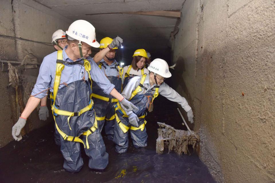 高雄市長韓國瑜今日至高雄市三民區同盟二路與自立一路口視察下水道,聽取水利局簡報說明後,他穿著安全裝備,親自爬進下水道箱涵視察。他說,由於高雄市政府努力進行雨水下水道清淤,因此,近期數波強降雨高雄都未淹水、排水清況相當良好,讓高雄市民免受淹水之苦。