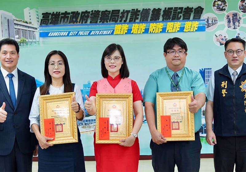 高市警察局6月18日舉行金融機構攔阻防詐座談會,金融機構分行代表、各分局長、偵查隊長等人與會,市警局長林炎田(圖一左一)分析警政署打詐儀錶板數據及提出最新防詐策略,刑警大隊大隊長鄢志豪(圖一右一)簡報高風險社群通報網,結合金融機構與警政機關,即時通報可疑提現案,強化預警及處置效率。會中另邀請金融機構岡山分行經理楊婉麗(圖一左二)、高雄分行經理王麗雅(圖一中)、郵局經理陳義文(圖一右二)等人分享臨櫃阻詐經驗,林炎田頒狀表達感謝。圖/市警局提供、文/高培德