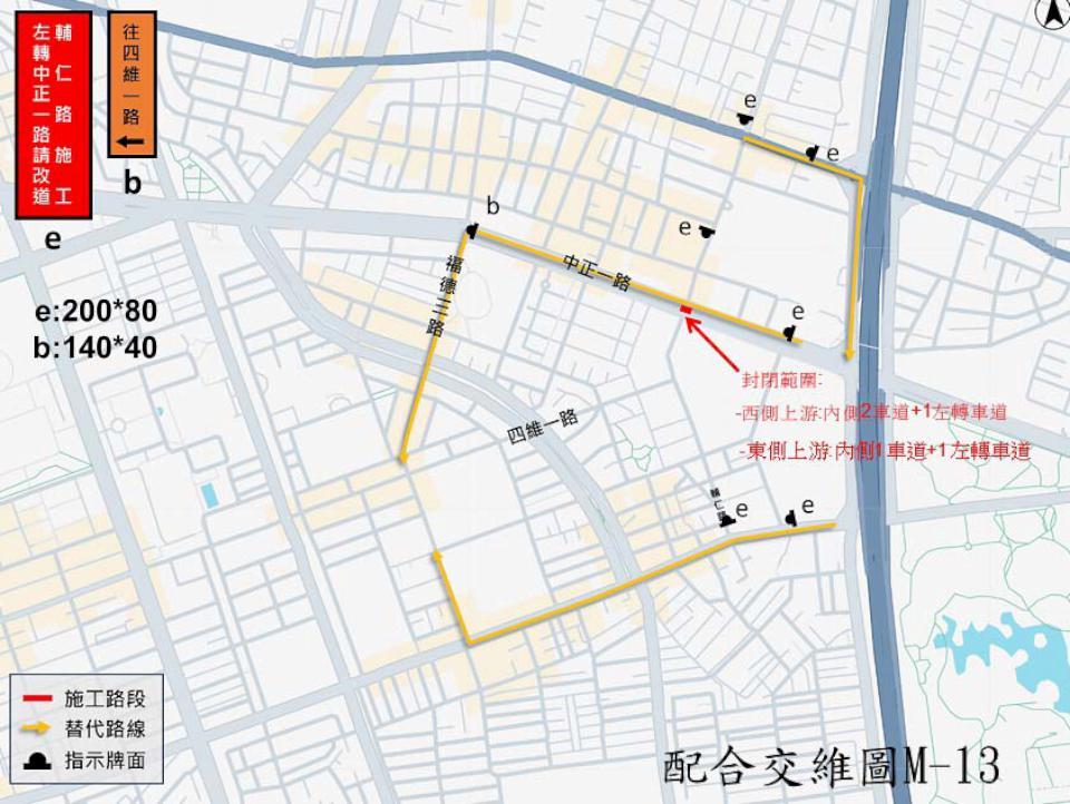 高雄捷運O9聯開案周邊都市計畫道路新闢工程8月4日至12日晚上9點至隔天上午6點鋼筋混凝土管(RCP)施作,中正一路西向左轉車道(輔仁路口)、快車道及慢車道(中正一路、輔仁路口)階段性管制,籲請用路人改走體育場路、福德三路、正言街等路段。