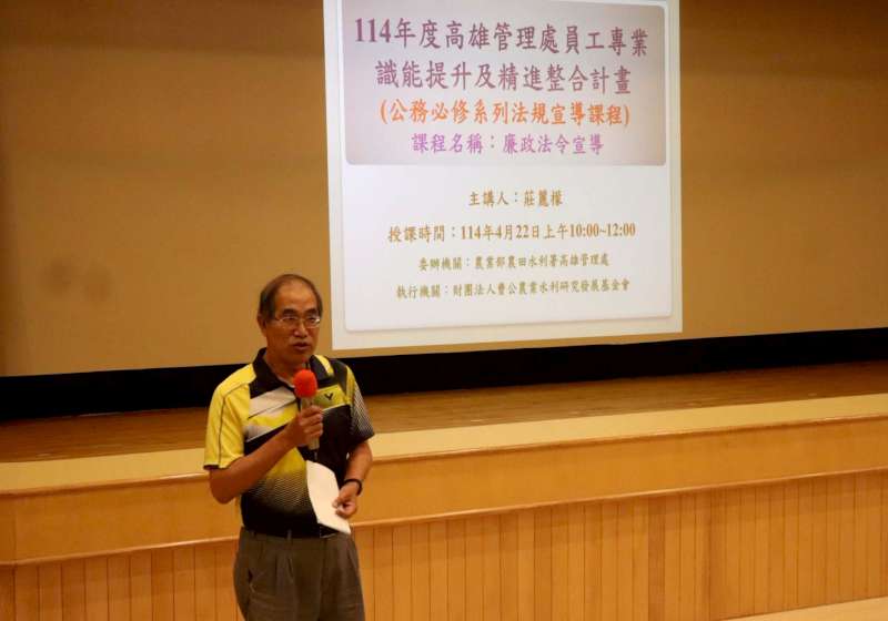 農田水利署高雄管理處4月22日舉行第一梯次政風宣導講座,邀請高雄地檢署主任檢察官魏豪勇(圖一)主講「圖利與便民」、農業部畜產試驗所政風室主任莊麗檬(圖二)分享「農田水利事業人員廉政倫理與規範」,高管處代理副處長謝啟文(圖三)說,農水署改制公務機關,美年辦理政風宣導,期勉同仁積極參與,強化法令知能,快速應變協處。