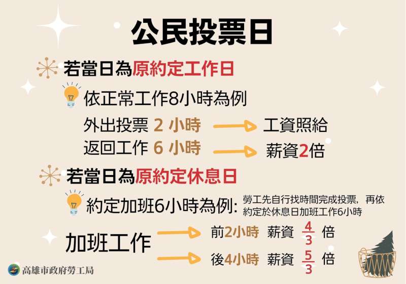高市勞工局特別提醒8月23日公民投票,設籍中華民國滿18歲且未受監護宣告國民可投票,根據勞動基準法第37條規定全國放假一天,雇主徵得勞工同意出勤應加發工資及保障投票權。