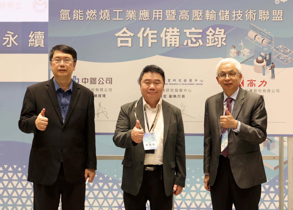 財團法人金屬工業研究發展中心副執行長武威宏(圖中)與中鋼副總劉宏義(圖左)、高力熱處理董事長吳誌雄(圖右)簽署氫能燃燒工業應用暨高壓輸儲技術聯盟合作備忘錄(MOU),宣示攜手推廣氫能技術應用工業領域。圖/金屬中心提供、文/高培德
