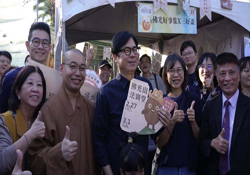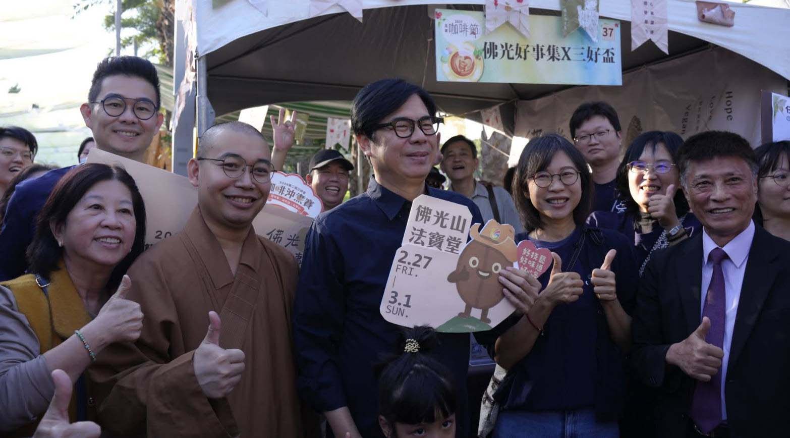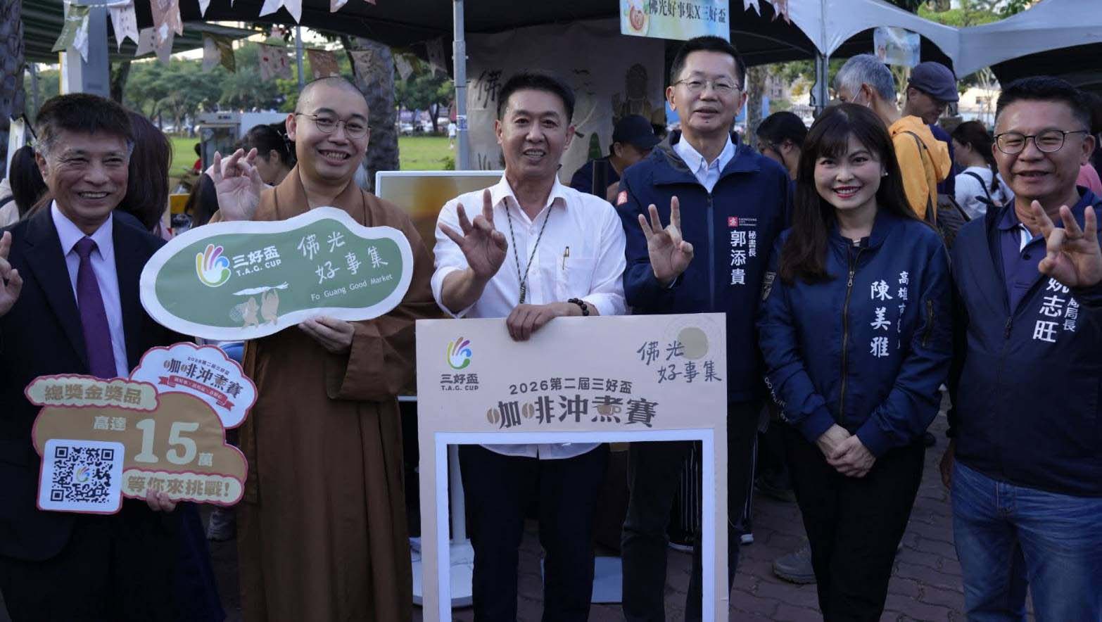 高市大樹區佛光山寺法寶堂「2026第二屆三好盃咖啡沖煮賽暨佛光好事集—啡揚高屏・香聚三好」11月22日及23日前進2025高雄咖啡節,規劃闖關遊戲、咖啡試飲、摸彩等,為115年2月27日至3月1日在法寶堂舉行正式活動造勢加溫,高雄市長陳其邁、市府秘書長郭添貴(圖二右三)、觀光局長高閔琳、農業局長姚志旺(圖二右一)、原民會主委阿布斯等人走訪攤位,聽取法寶堂主任慧寂法師(圖二左二)解說,郭添貴說,高市咖啡面積約80公頃,排名全台第4,茂林、桃源、那瑪夏等區居多數,高閔琳說,活動邀集冠軍得主等參展60個攤位,同時推廣高市3原住民行政區部落自產自銷咖啡。