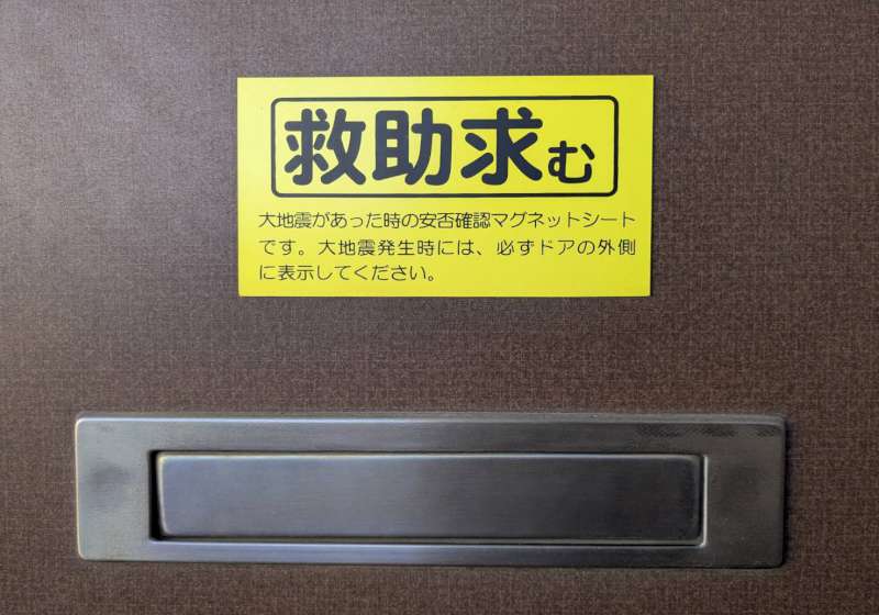 今年年初,大樓的自治會發了一份防災通知,裡面除了災後應變的說明之外,還附上一個10公分大小的磁鐵牌子,可以貼在冰箱的那種。一面寫著「安全」,另一面寫著「需要救助」。這個用途是,災難發生後,貼在自家的大門外面,用來讓搜救人員迅速了解屋內住戶的狀況。