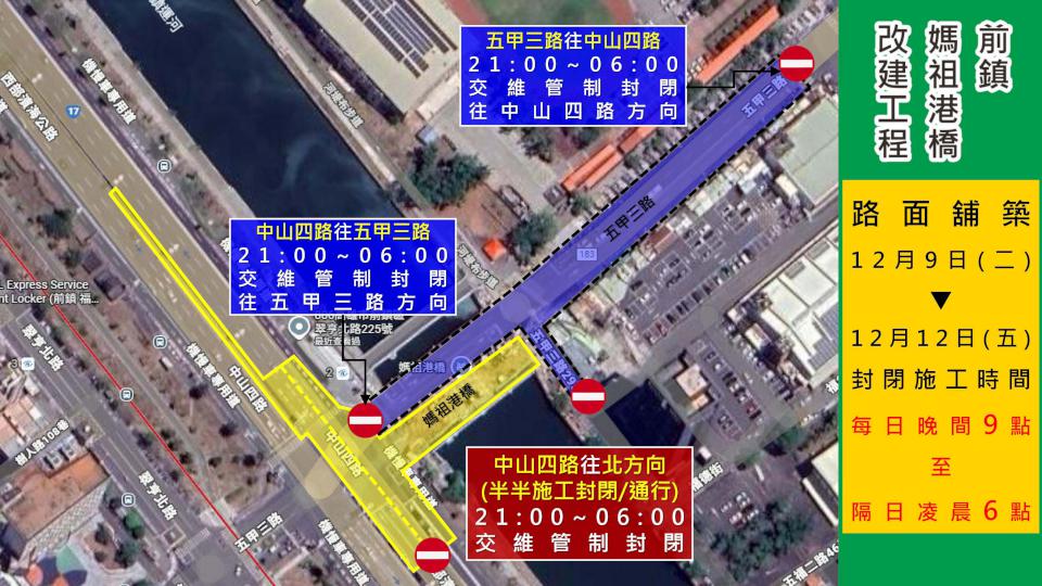 高市前鎮媽祖港橋12月9日至12日施工 工務局新工處籲請用路人提前改道