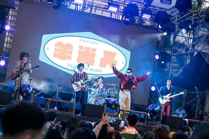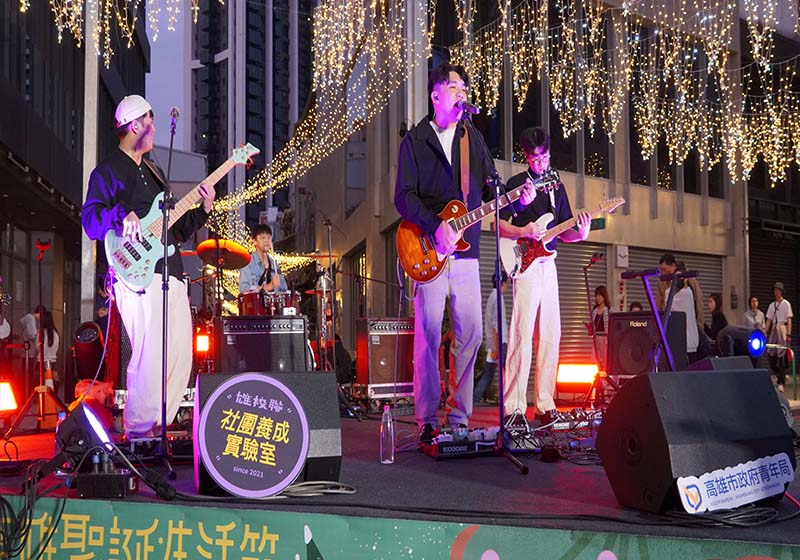 高市青年局高速青春青年創新音樂發展培育計畫育成樂團聽聽就好(Just Listen)(圖一)、津波(Tsunami)(圖二)雄校聯社團養成實驗室外Merry Band Vibes 街頭盛典率先開唱,羊米人(YUMMY MAN)(圖三)與宇宙資料庫(圖四)中央公園2025 聖誕生活節接力獻藝,另多支新銳樂團12月20日至25日受邀多場聖誕活動,青年局長林楷軒說,高速青春邁入第5年,加速人才培育,協助青年圓夢,市府致力縮短青年與音樂產業距離,挹注新生代樂團成長能量。