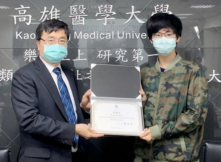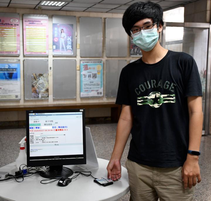 因應中國武漢肺炎疫情,高雄醫學大學3月4日管制訪客入校,宿舍僅開放住校學生進出,宿舍樓長、醫務管理暨醫療資訊系學生葉品誠(圖一)運用專長加裝判別住宿生身分功能機制,完成體溫量測住校生刷卡同時響起音效快速通關,未受測及非住宿生發出警示提醒管理人員,大幅縮減住宿生排隊等候時間,校長鐘育志(圖二左)4月1日利用防疫會議頒感謝狀嘉勉貢獻。
