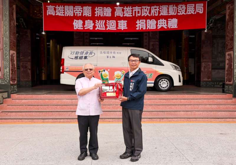 高雄關帝廟主委黃富濃12月24日捐贈行動健身房巡迴車一輛及健身器材一批,高市運動發展局長侯尊堯代表接受並回贈感謝狀及獎座,黃富濃說,期能用行動回饋社會,感謝市府攜手服務市民,更多行動健身房巡迴車資訊可上運發局官網及官方社群查詢。圖/運發局提供、文/高培德