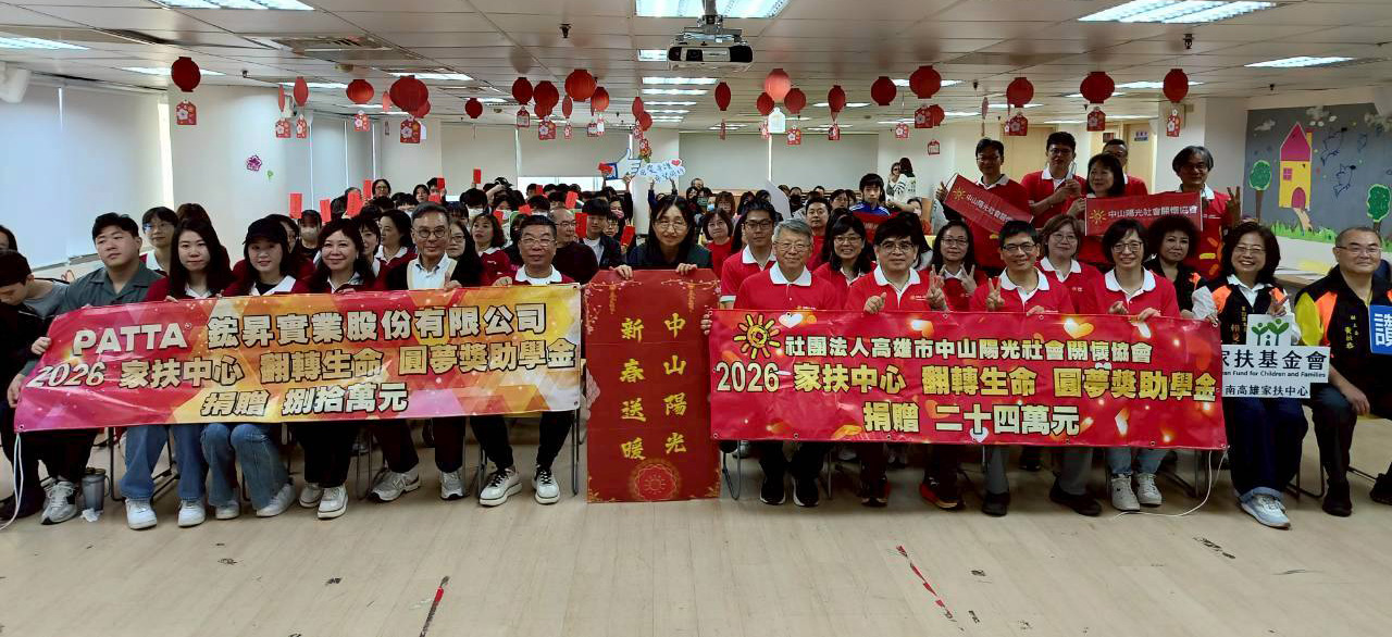 國立中山大學高階經營管理碩士在職專班(EMBA)校友組成中山陽光社會關懷協會攜手鋐昇實業捐資100萬元,1月31日獎助南高雄家扶中心346名成績優異及學業進步國中小學生,南家扶中心扶幼主委賴曼綺代表回贈中山陽光社會關懷協會理事長金永欽、鋐昇實業董事長黃文彬感謝狀,三人並手持象徵堅持、守護、支持燈籠傳遞祝福,鼓勵弱勢孩子超越逆境、勇敢前行。