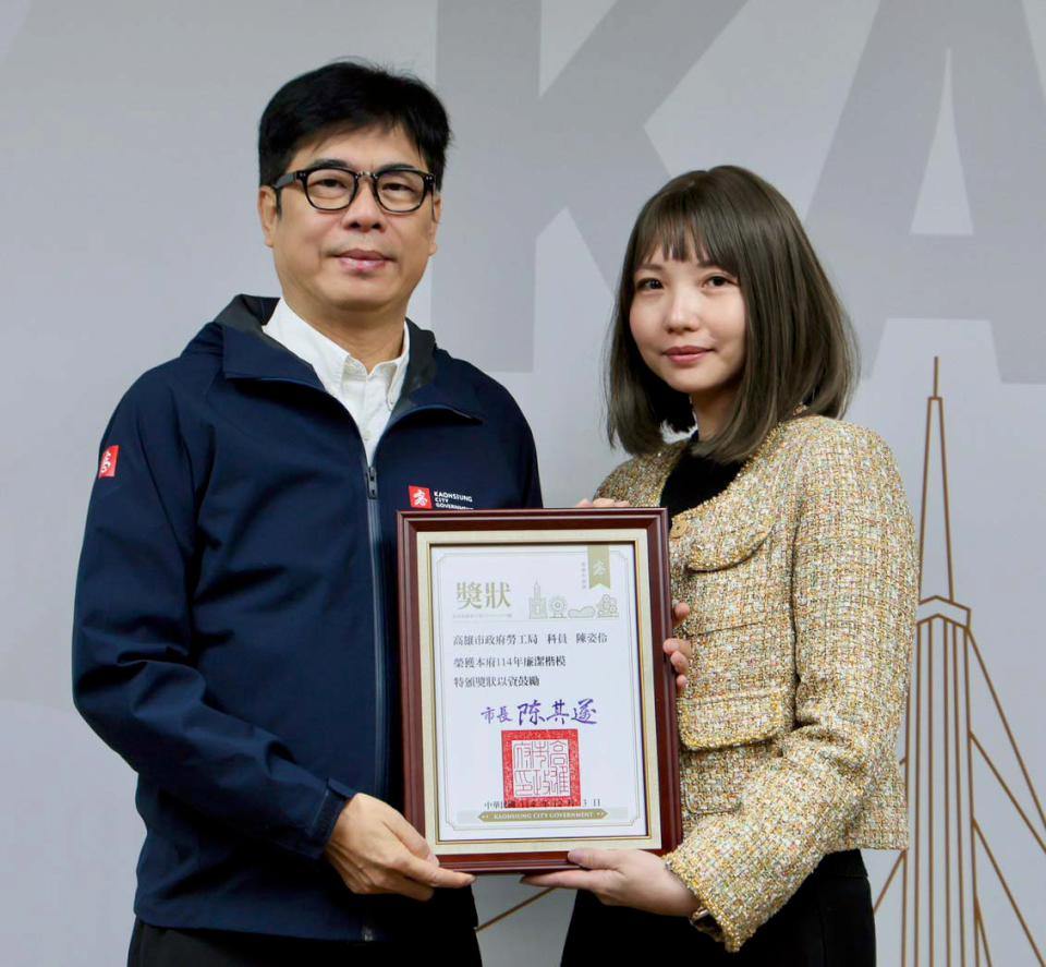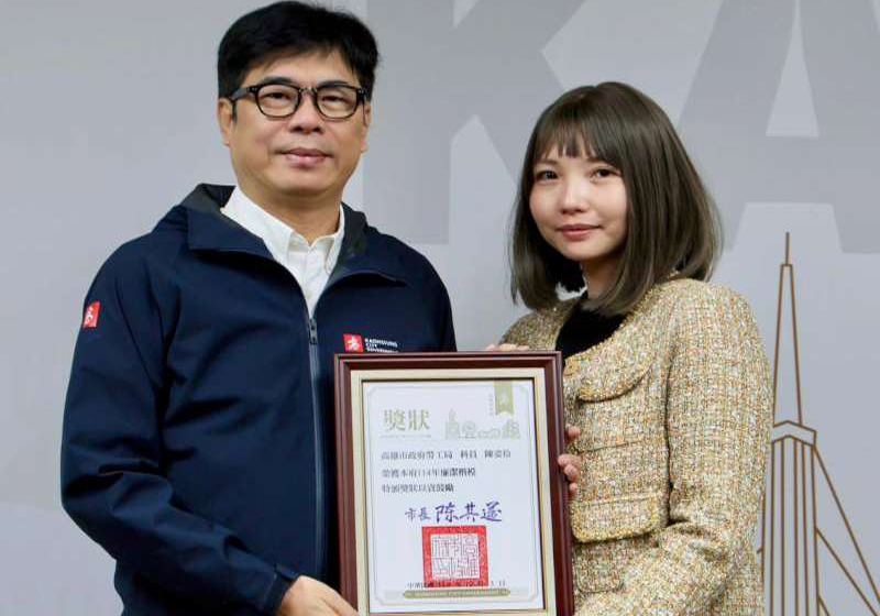 高市勞工局職業重建科科員陳姿伶(圖右)致力提供身心障礙者就業與精神障礙者社區支持服務,經手逾2000萬元採購案,展現廉潔操守獲選高市府114年廉潔楷模,1月20日市政會議接受市長陳其邁(圖左)公開表揚。