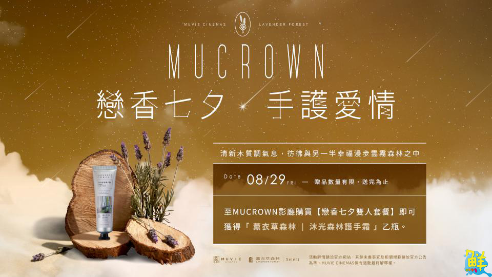 首先是MUCROWN影廳的「戀香七夕 手護愛情」活動,凡08/29(五)至MUCROWN影廳購買「戀香七夕雙人套餐」,即可獲得「薰衣草森林 | 沐光森林護手霜」乙瓶。(數量有限,送完為止)