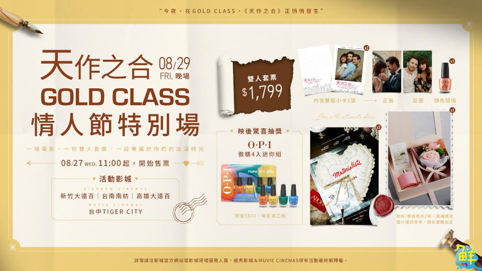 另外GOLD CLASS頂級影廳也推出08/29(五)晚場《天作之合》情人節特別場,雙人套票$1,799。內含2張《天作之合》GOLD CLASS電影票,還能獲得1瓶OPI經典指甲油(顏色隨機)、2張獨家電影傳情小卡、2張獨家愛心蛋糕A3海報、爆米花1份、碳酸飲料2份、薯條+起司條拼盤1份、雞翅盤1份、覆盆子奶酪或焦糖烤布蕾(擇2)、攷瑰花禮盒1份(隨機贈送),而且還有映後模彩箱加碼抽獎:OPI傲驕4入迷你組。