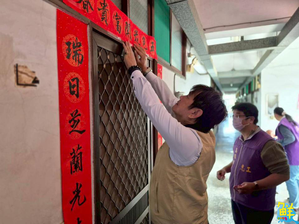 ▲春聯換新後,伯伯笑稱「像新娘房」,充滿喜氣,現場洋溢溫馨過年氛圍。