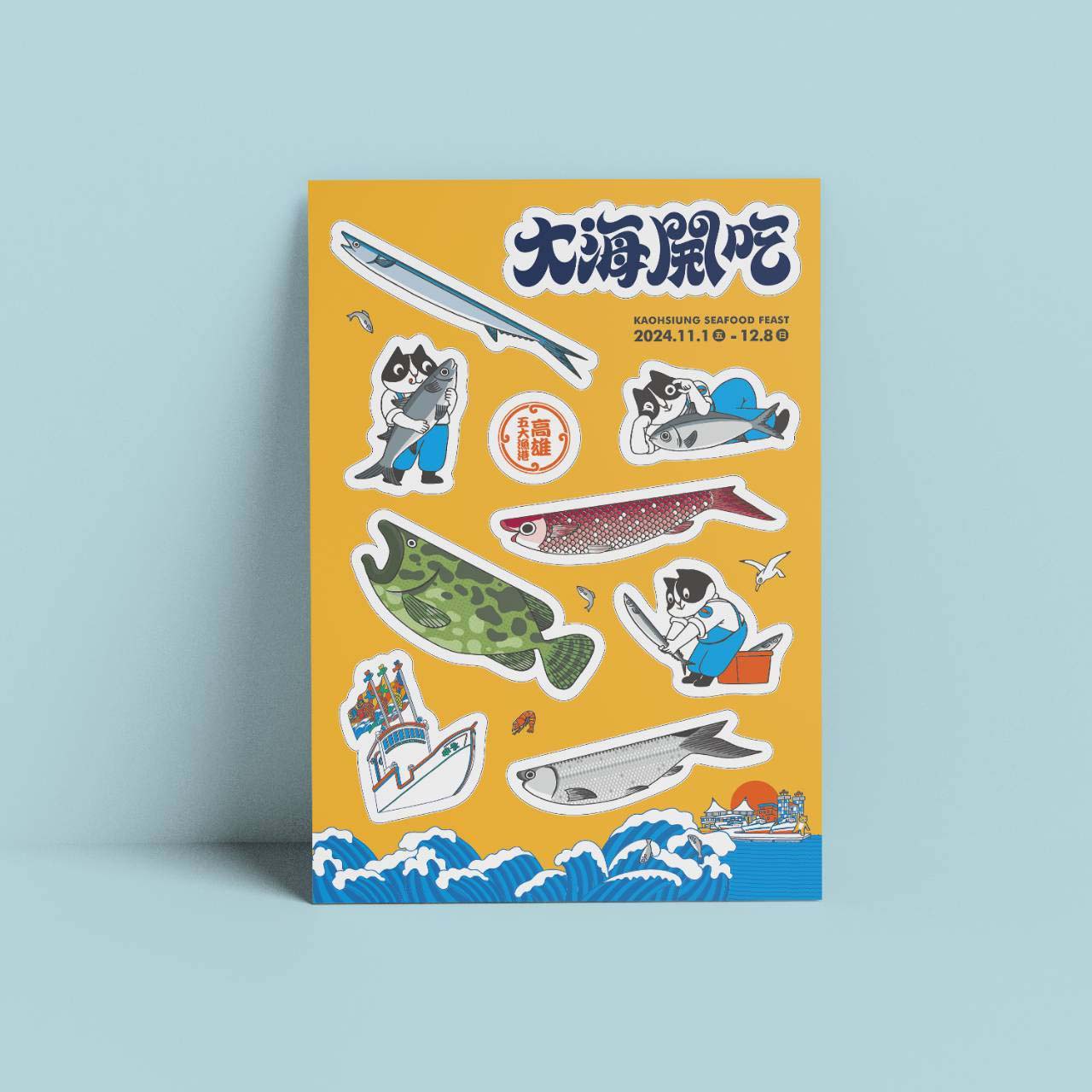 高市海洋局邀集5區公所及漁會,結合彌陀、永新、興達港、前鎮及蚵子寮等5漁港推出2024大海開吃系列活動,商請在地藝術家Croter(洪添賢)取材貓董IP串連五大漁港特色漁產製作躺在草地與虱目魚玩耍 (現流底家)、站在景觀台旁收藏烏魚(烏金滿艙)、待在沙灘釣秋刀魚(大魚上鉤等大型氣球裝置、高雄魚旗、活動主視覺港口意象等5款大型裝置藝術,11月4日至27日在行政院農業部漁業署漁港環境評鑑三星獎、獲選情定今生系列魅力漁港第一名、台灣河溪網協會金蘋果獎彌陀漁港海岸光廊參展,11月9、10、16、17、23、24日邀請龍門表演藝術工作坊等團體演出,並邀集餐車市集進駐,上傳其中一款藝術裝置合照至個人社群打卡可兌換藝術家插畫貼紙一張,限量1000張,數量有限,送完為止,更多活動資訊可上海洋局高雄海味地圖官方社群查詢。圖/海洋局提供、文/高培德