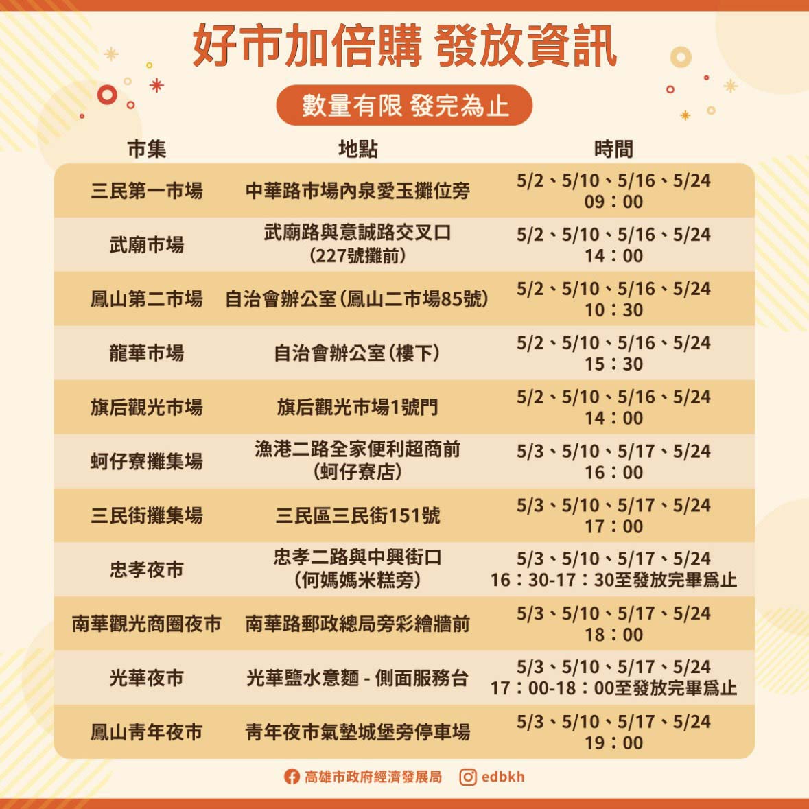 經濟部5月1日至31日辦理「眾星雲集好市加倍購」活動,邀集全台逾100處特色市集參與,活動期間前往高市市場、三民第一市場、武廟市場、鳳山第二市場、旗后觀光市場、光華夜市、三民街攤集場、蚵仔寮、忠孝夜市、南華夜市、鳳山青年夜市等地消費,並自備環保袋、杯、餐具等,可用100元加購200元好市加倍券一份,名額逾一萬份,換完為止。