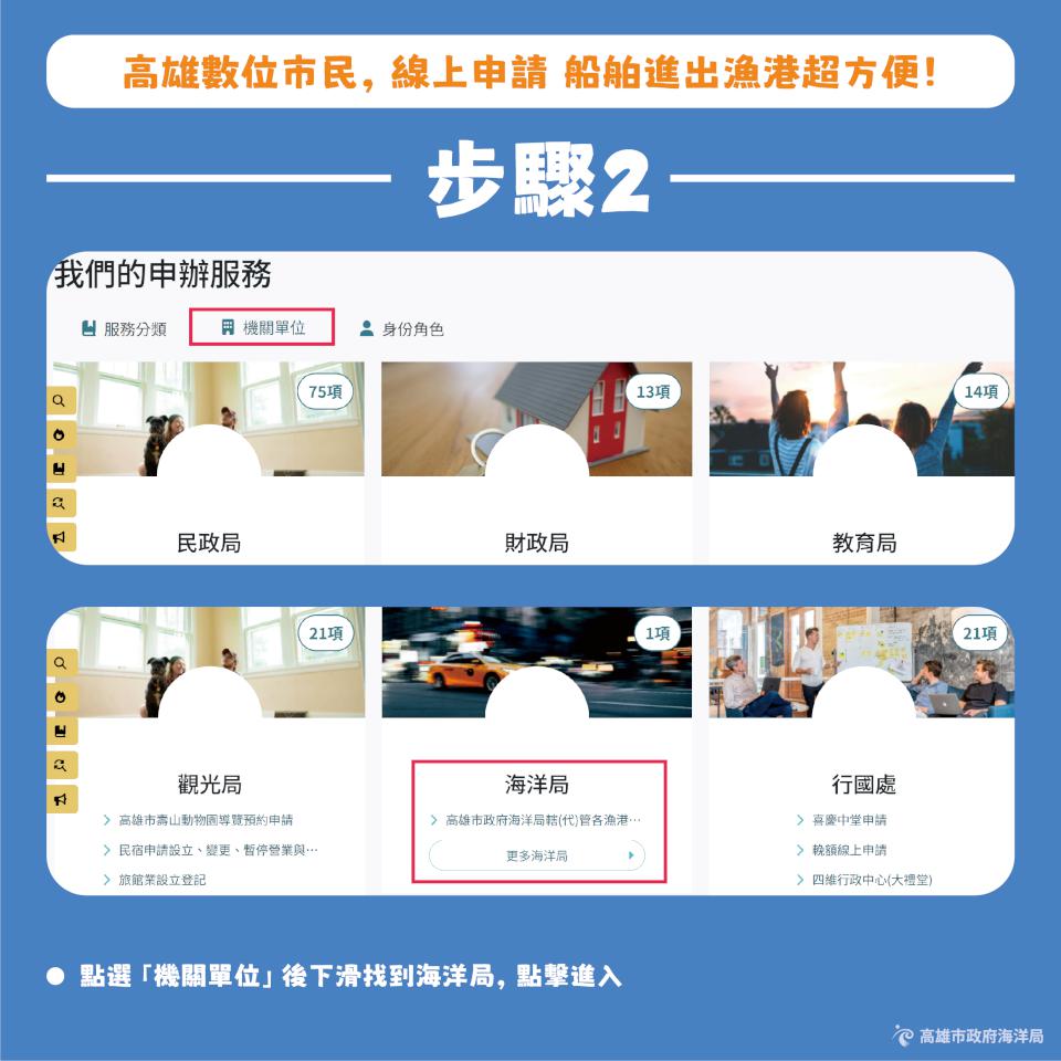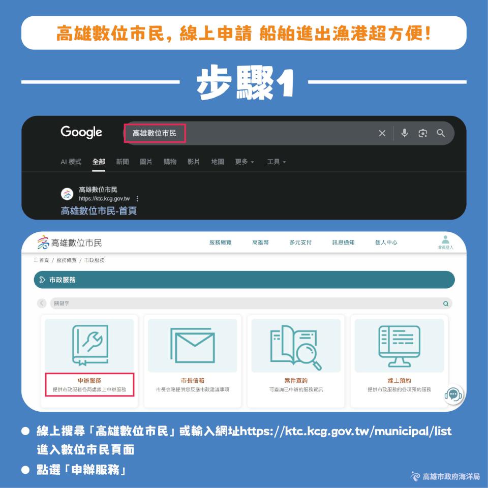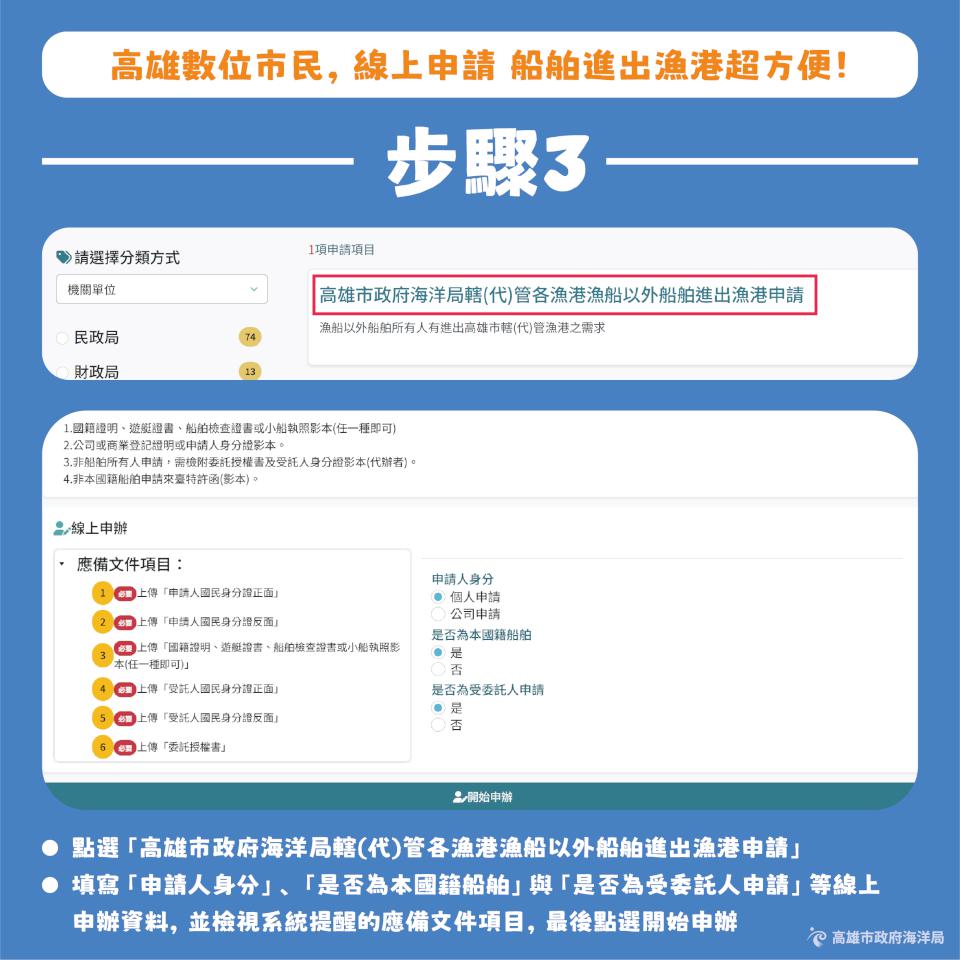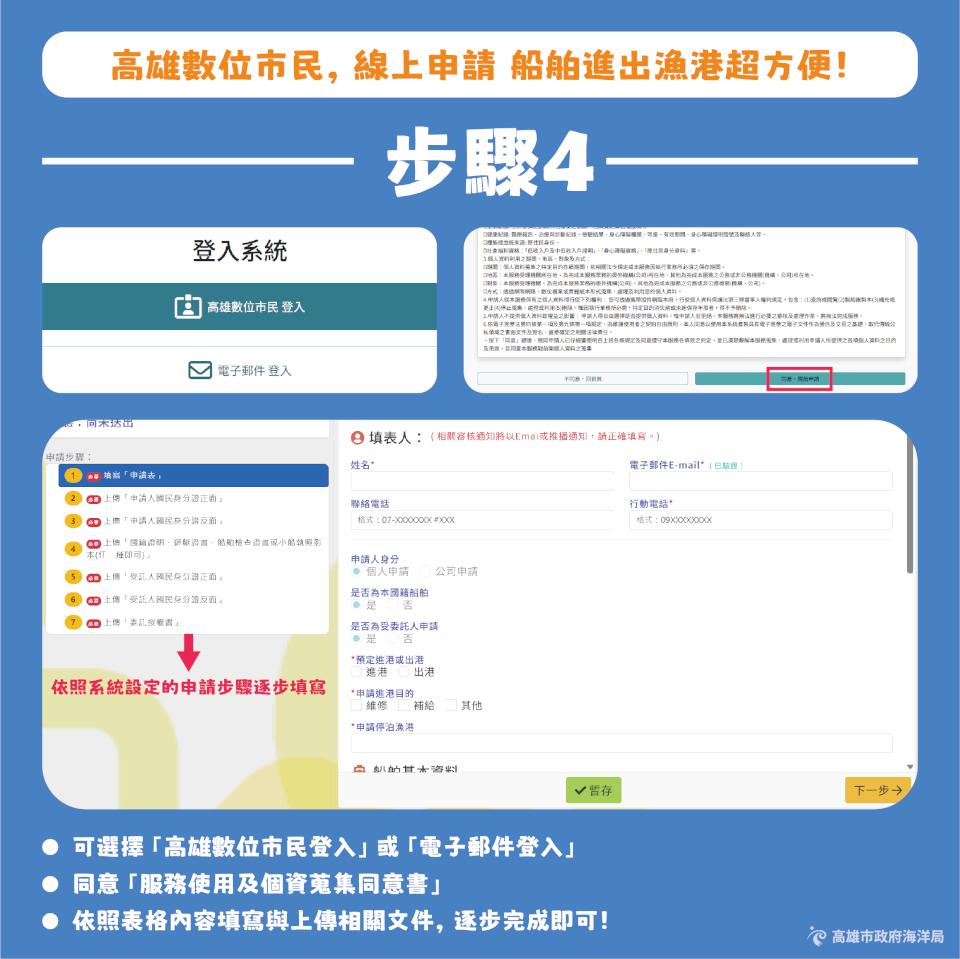 高市海洋局建置高雄數位市民官網,上傳船舶資料、航次資訊及相關文件申請船舶進出港,還能即時查詢審核進度,提升資訊準確率及降低人為失誤風險,縮短作業時間與樽節人力成本,持續廣納各界意見,並機動優化系統功能與操作介面,提升使用滿意度。
