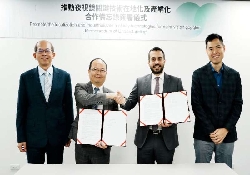 在國科會科技辦公室執行秘書張振豪(圖左一)、Theon Sensors S.A 經理Goh Yang Xuan(圖右一)等人見證下,財團法人金屬工業研究發展中心執行長賴永祥(圖左二)6月9日與希臘國防光電科技Theon Sensors S.A.總監Dimitris Papageorgiou(圖右二)簽署合作備忘錄(MOU),宣示攜手合推評估夜視鏡關鍵技術開發可行性、夜視鏡關鍵技術產業化、拓展國內外夜視鏡市場機會、探索可互補技術領域合作機會等,期能帶動產業升級,提升國防自主量能與產業韌性。