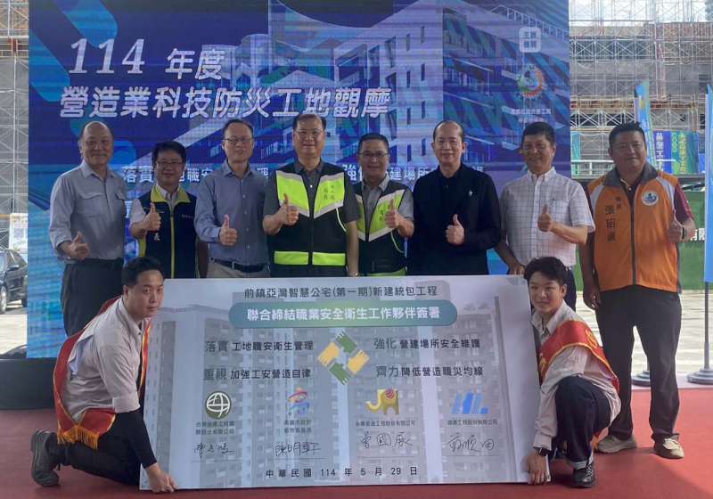 高市現有25處社會住宅興建中,勞工局長江健興、都發局總工程司陳明軒、勞動檢查處處長郭清吉、國土署南工分署分署長林敬賢、營造業南區安全衛生促進會會長張昭鎮、永青營造工程總裁曾國展等人訪視前鎮區亞灣智慧公宅觀摩國家標準CNS4750施工架組立示範、梁模地面預組吊裝工法、電梯井組模施工防墜平台爬升演練、高空工作車指紋辨識開機及防撞警示系統等科技防災,期能提升作業安全,降低職災風險。