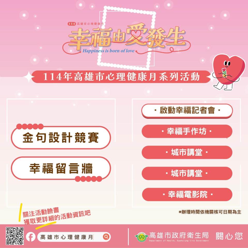 高市衛生局民國100年制定9月9日至10月9日心理健康月,秉持五動美麗人生核心理念,設計「快樂」、「同理」、「愛」、「韌力」與「感恩」等主題,活動聚焦幸福由愛發生,規劃金句設計競賽、線上抽獎、心理健康講座、電影播映、工作坊等等系列,113年金句設計競賽金獎「我懂你在雨中滯留,你懂我在傘下守候」呼應主題「搭起同理橋梁」,114年聚焦「用一句話說出你心中的幸福與愛」,7月4日徵件截止,預計9月7日公布得獎金句。