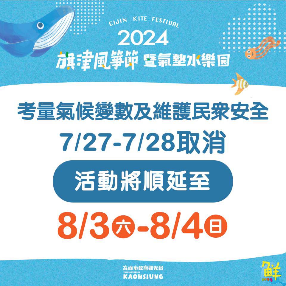 原訂7月27、28日舉辦的「2024旗津風箏節暨氣墊水樂園」活動取消,順延一週辦理,歡迎遊客8月3、4日再訪旗津,賞風箏玩氣墊吃美食。