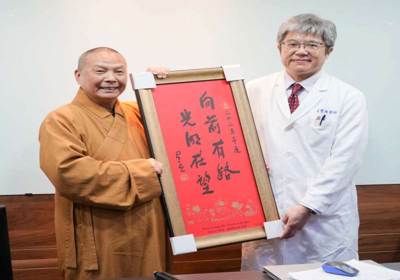 高市大樹區佛光山寺常務副住持、都監院院長慧傳法師(圖左)1月7日致贈已故創辦人星雲大師墨寶春聯「向前有路‧光明在望」及臘八粥,高市民生醫院代理院長黃豐締(圖右)代表接受,黃豐締說,感謝寺方送上剛出爐臘八粥,傳達深刻祝福,激勵醫護人員秉持熱誠與專業提供優質服務。慧傳法師說,臘八粥象徵祝福及圓滿,春聯祈願新年更好。圖/民生醫院提供、文/高培德