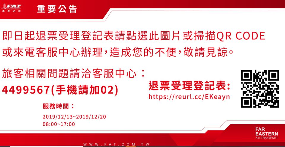 主任消保官殷茂乾進一步表示,至於消費者因遠東航空停飛所發生的損失,參加團體旅遊之消費者可逕洽主辦的旅行社請其協助,自行訂票的消費者可保留因本次行程延誤所衍生之費用相關單據,事後再向遠東航空公司提出求償,相關事宜可先洽詢遠航客服中心(專線4499567、手機請加02)或上遠航公司臉書官網查詢。