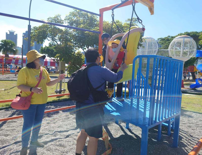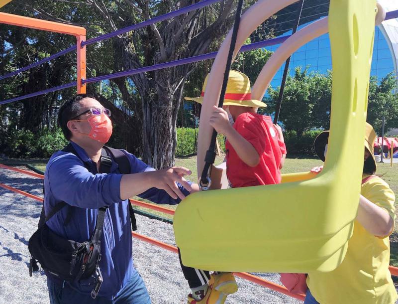 園區施工期間歷經天候及新冠肺炎疫情等變數,加上地墊及遊具經標準檢驗局及台灣商品檢測驗證中心認證符合安全規範,並新增星光區加強夜間照明。